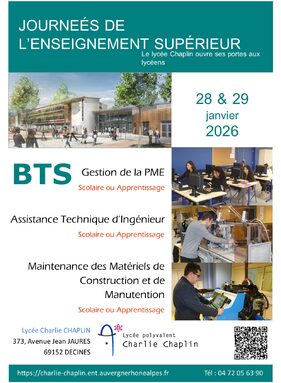 Le lycée CHAPLIN ouvrira ses portes pour présenter ses trois BTS en formation scolaire et en apprentissage.
