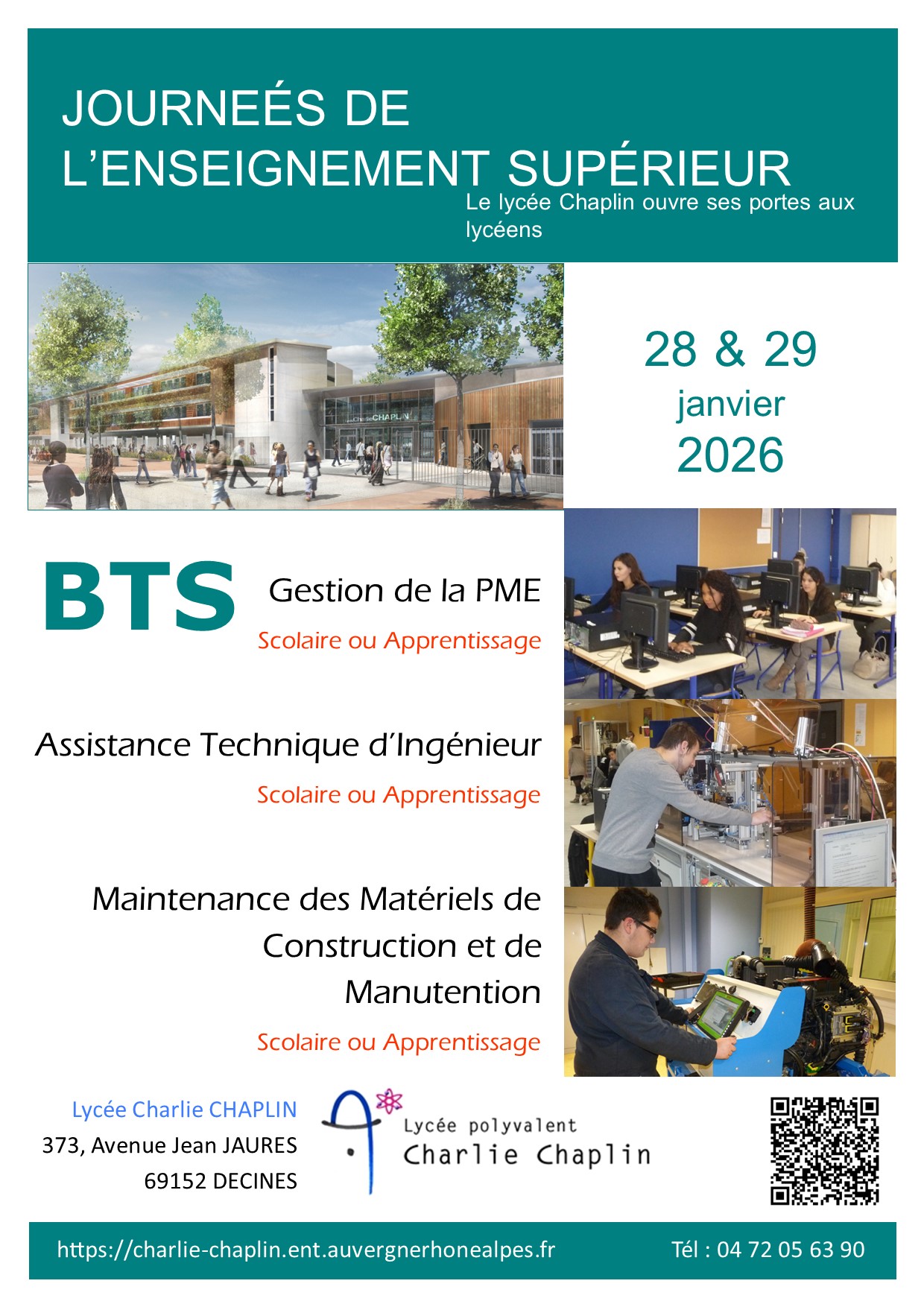 Le lycée CHAPLIN ouvrira ses portes pour présenter ses trois BTS en formation scolaire et en apprentissage.
